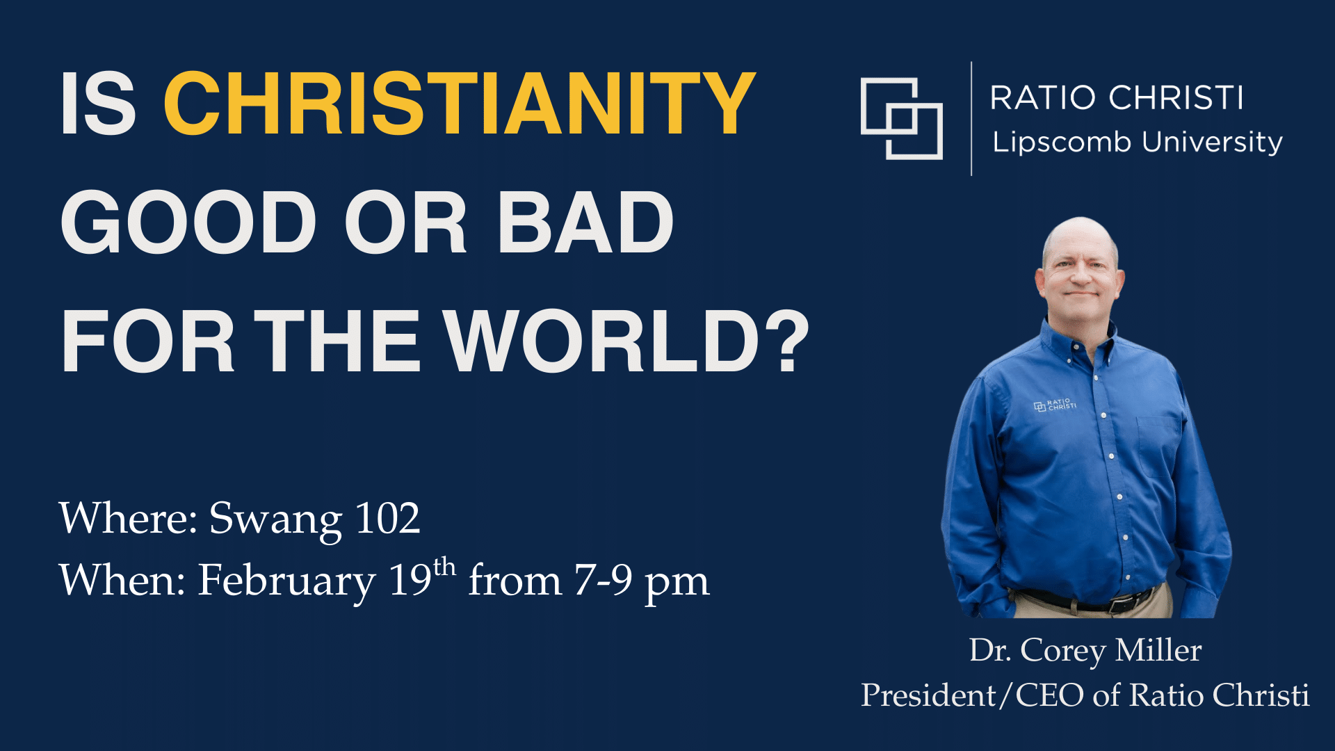 Join us to hear Corey Miller (PhD, President/CEO of Ratio Christi) make a compelling case that Christianity is not only true, but also profoundly beneficial to the world. An open Q&A session will follow.